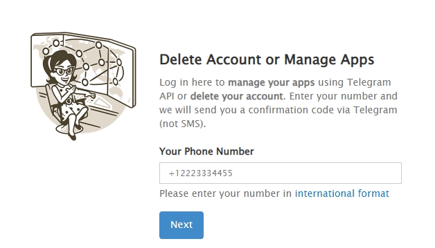 Log in at https://my.telegram.org/ Put your number and enter the code that telegram sends you